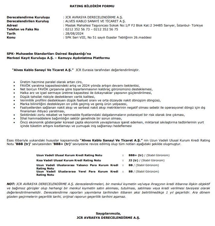 Buna göre Esas itibariyle aşağıdaki hususlar kapsamında “Alves Kablo Sanayi Ve Ticaret A.Ş.” nin Uzun Vadeli Ulusal Kurum Kredi Rating Notu ‘BBB (tr)’ seviyesinden ‘BBB+ (tr)’ seviyesine revize edilmiş olup tüm notları aşağıdaki şekilde oluşmuştur.
