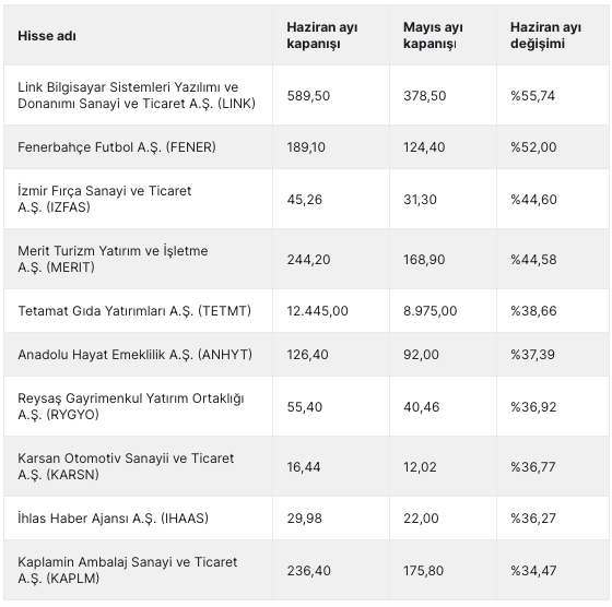 Haziran’da %55,74 değer kazanan Link Bilgisayar Sistemleri Yazılımı ve Donanımı Sanayi ve Ticaret A.Ş. (LINK) ilk sırada yer alırken onu Anadolu Hayat Emeklilik A.Ş. (ANHYT), Karsan Otomotiv Sanayii ve Ticaret A.Ş. (KARSN) ve Fenerbahçe Futbol A.Ş. (FENER) gibi hisseler takip etti.