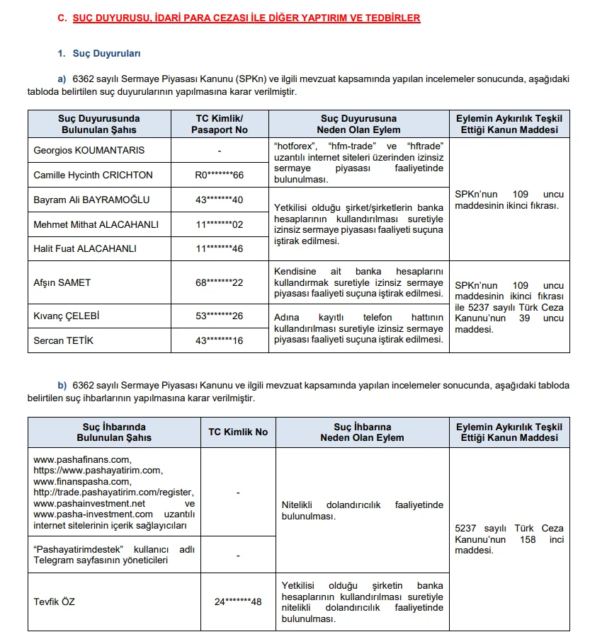 Sermaye Piyasası Kurulu’nun (SPK) bu akşam yayımladığı bültende; 6362 sayılı Sermaye Piyasası Kanunu (SPKn) ve ilgili mevzuat kapsamında yapılan incelemeler sonucunda, aşağıdaki tabloda belirtilen suç duyurularının yapılmasına karar verildi.