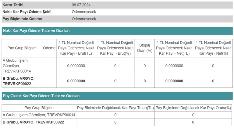 Vera Konsept Gayrimenkul Yatırım Ortaklığı A.Ş. (VRGYO), 8 Temmuz 2024 tarihinde Kamuyu Aydınlatma Platformu’na (KAP) yaptığı açıklamada, yönetim kurulu kararı doğrultusunda kar payı dağıtımı ile ilgili bilgi verdi.
