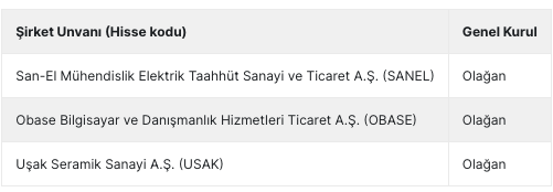 1 Temmuz 2024 Pazartesi günü Genel Kurula giden şirketler şu şekilde;