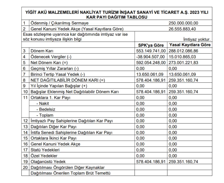 Yiğit Akü yönetimi tarafından hazırlanan ve Note Office Uluslararası Bağımsız Denetim Danışmanlık ve Yeminli Mali Müşavirlik A.Ş. tarafından denetlenen, 1 Ocak 2023 – 31 Aralık 2023 hesap dönemine ilişkin, TMS/TFRS esasına göre hazırlanan finansal tablolar ile yasal kayıtlara göre oluşan finansal tabloların incelenmesi sonucunda ekte yer alan kar dağıtım tablosundan da görüldüğü üzere;