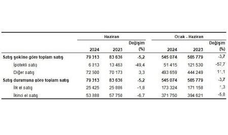 Türkiye genelinde konut satışları Haziran ayında bir önceki yılın aynı ayına göre %5,2 azalarak 79 bin 313 oldu. Konut satış sayısının en fazla olduğu iller sırasıyla 13 bin 25 ile İstanbul, 6 bin 866 ile Ankara ve 4 bin 361 ile İzmir olurken, en az olduğu iller sırasıyla 34 ile Ardahan, 40 ile Hakkari, 44 ile Tunceli ve Bayburt oldu.