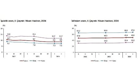 Hanehalkı İşgücü Araştırması sonuçlarına göre; 15 ve daha yukarı yaştaki kişilerde işsiz sayısı 2024 yılı II. çeyreğinde bir önceki çeyreğe göre 23 bin kişi artarak 3 milyon 156 bin kişi oldu. İşsizlik oranı ise değişim göstermeyerek %8,8 seviyesinde gerçekleşti. İşsizlik oranı erkeklerde %7,3, kadınlarda %11,7 olarak tahmin edildi.